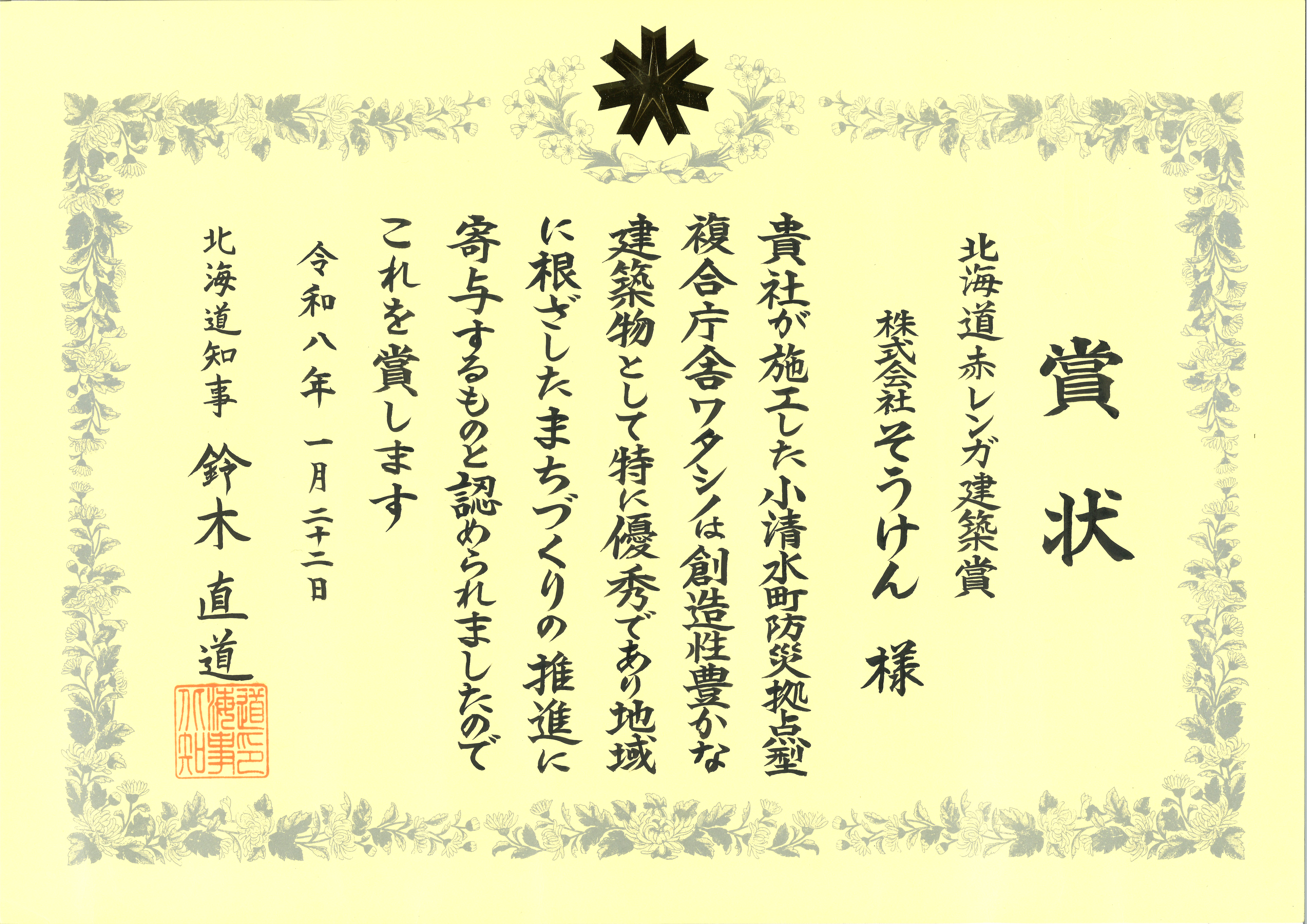 令和8年1月22日、赤れんが庁舎にて北海道知事より北海道赤レンガ建築賞をいただきました。