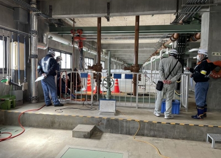 ・網走市汚水処理施設等包括的維持管理業務委託では、浄化センターでの現地作業状況を確認したが、オイル交換時での飛散防止措置や電源停止明示の実施等安全に作業されていた。また機械室は広く照度も問題ない状況であり良い。