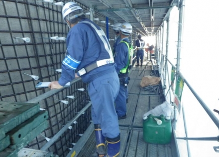 ・一般国道39号美幌町美幌大橋下部耐震補強工事では現地確認を行なったところ、仮設足場作業は完了していて既設構造物調査との事だが、足場使用での点検確認や墜落制止用器具使用の周知を行い転落等の無いよう作業する事。