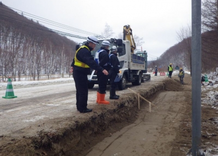 ・一般国道39号網走市網走道路維持除雪外一連工事では、国道238号線での応急処理工 防雪柵下部常設作業状況を確認したが、降雪によりバックホー位置が高くなり架空線に近くなった箇所もあるが担当職員は監視を継続し安全に進められていた。作業区間が曲線内側なので一般車両からの確認がしづらいと思われるが、交通誘導警備員にはわかりやすい合図を徹底するよう周知してもらいたい。