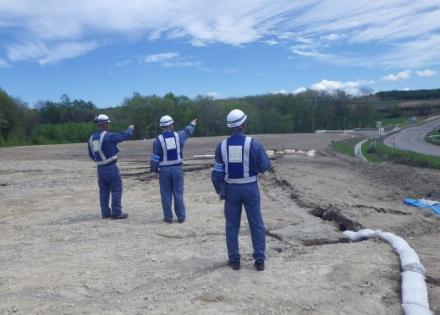 ・畑地帯網走南部東第2外2地区72工区では現場事務所・安全掲示板等を確認したが、掲示物は見やすく配置されて事務所周辺も整理整頓されていて良いと思われる。現地作業としては整地工10-2圃場を確認したところ、整地作業重機械同志の離隔及び測量作業者との離隔についても十分保たれている。重機械に接近することがある場合は確実に停止させるよう周知してもらいたい。